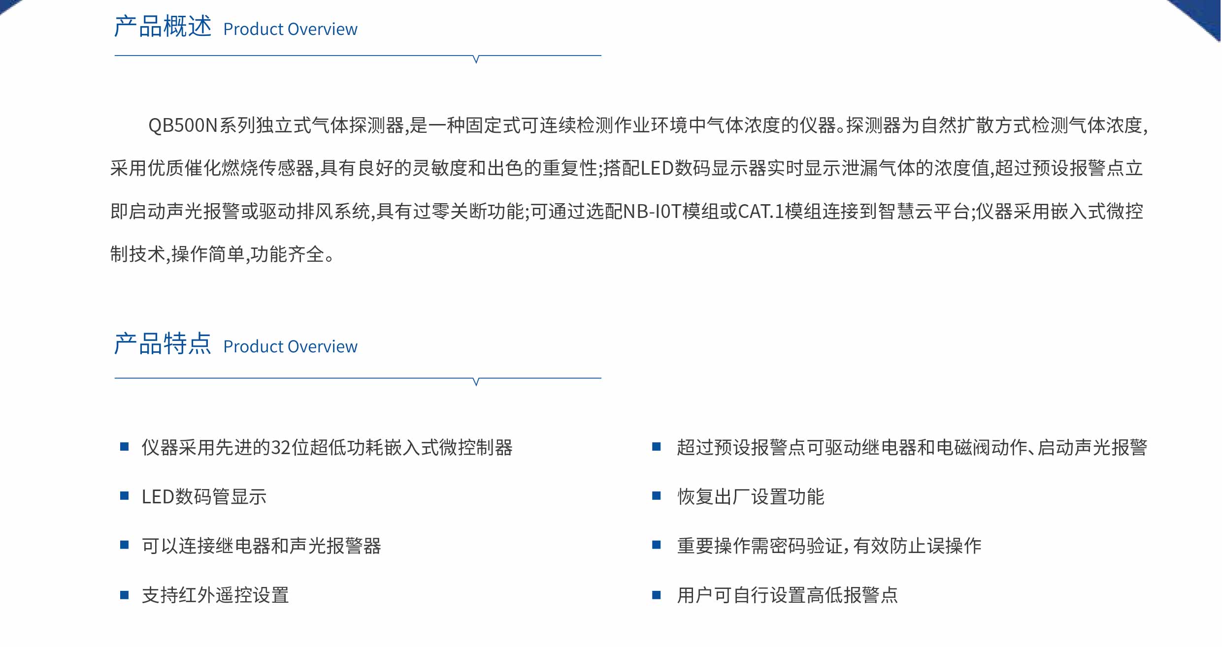 GTYQ-QB500N工業及商業用途點型氣體探測器(以下簡稱探測器),是一種固定式可連續檢測作業環境中氣體濃度的儀器。 探測器為自然擴散方式檢測氣體濃度,采用進口催化燃燒傳感器,具有很好的靈敏度和出色的重復性;適宜工廠應用的LED數碼顯示器實時顯示泄漏氣體的濃度值,超過預設報警點立即啟動聲光報警或驅動排風系統或驅動220V交流電磁閥或24V直流電磁閥,具有過零關斷功能;可通過選配NB-IoT模組連接到智慧云平臺;儀器采用嵌入式微控制技術,操作簡單,功能齊全,可靠性高,整機性能穩定、可靠。